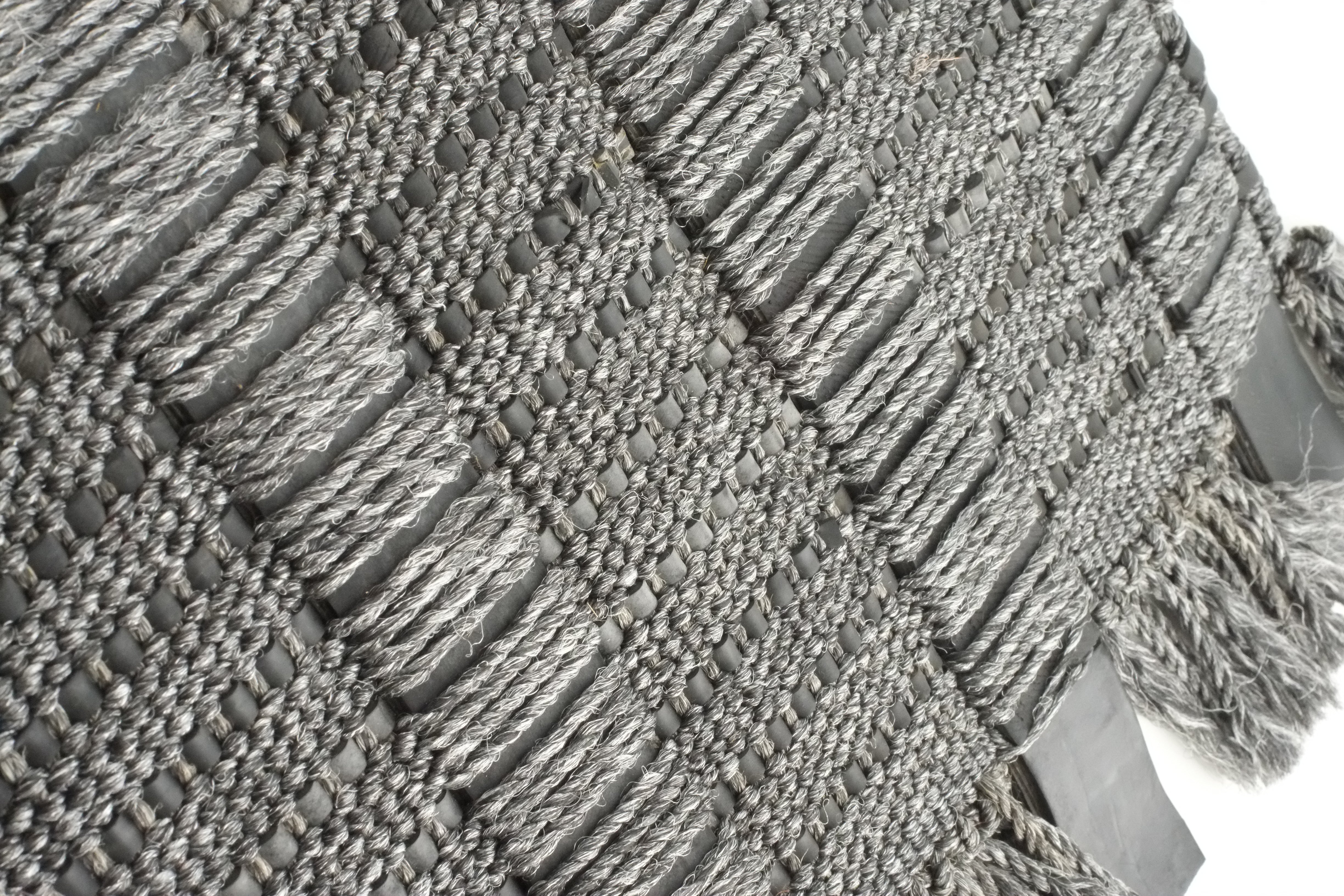 ). Il s'agit de notre premier tapis d'intérieur et d'extérieur. Nous avons passé beaucoup de temps à développer sa structure pour lui donner ce mélange spécial de graphisme et de sensation organique. Notre Rubber Rug est une pièce d'architecture tissée.
